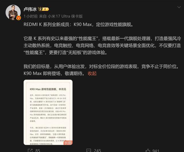 REDMI K90 Max今天正式官宣,作为K系列全新成员,这款机型定位游戏性能旗舰,是迄今为止K系列最强的“性能魔王”,将于本月正式登场。官方表示,K90 Max旨在打造无短板的游戏体验,对标全价位段的游戏表现,同时延续了K系列在创新和极致体验上的追求,让这一系列在性能层面具有更鲜明的产品辨识度。据悉,新机原本是K90至尊版的改名升级,首次加入了风冷主动散热设计,也是小米首款搭载该技术的机型。