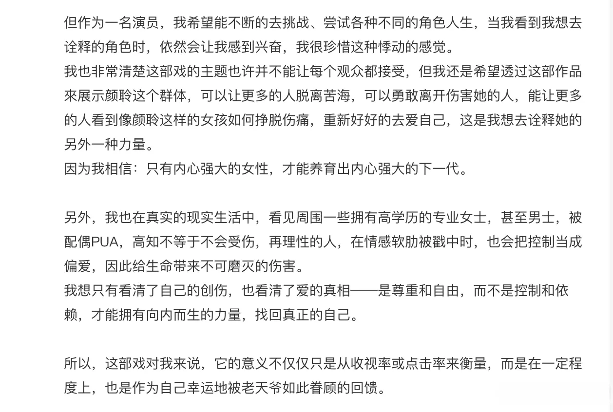 其次是,孙俪很清楚这部戏的主题也许并不能让每个观众都接受,但她还是希望通过这部作品展示颜聆这个群体,可以让更多的人脱离苦海,可以勇敢离开伤害她的人,能让更多的人看到像颜聆这样的女孩如何挣脱伤痛,重新好好的去爱自己。